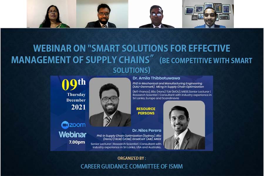 Another very successful online Webinar Session for all ISMM Students, Lecturers & members organized by Career Guidance Committee of ISMM was conducted on "SMART SOLUTIONS FOR EFFECTIVE MANAGEMENT OF SUPPLY CHAINS" 'Be competitive with smart solutions' on 09th December 2021 from 07.00 p.m. to 09.00 p.m. via ZOOM Platform with more than 250 participants.