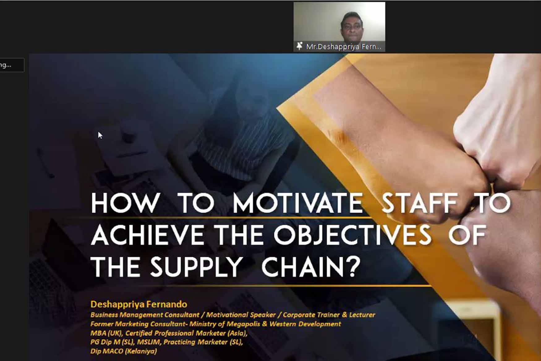 A Quarterly Seminar for GDPSCM Students was held on Sunday, 23rd January 2022 at 04.00 p.m via the ZOOM platform. The topic was "How to motivate staff to achieve the objectives of Supply Chain". The Resource Person was Mr.Deshappriya Fernando, Motivational Speaker, Sales Consultant, Corporate Traininer and Lecturer.