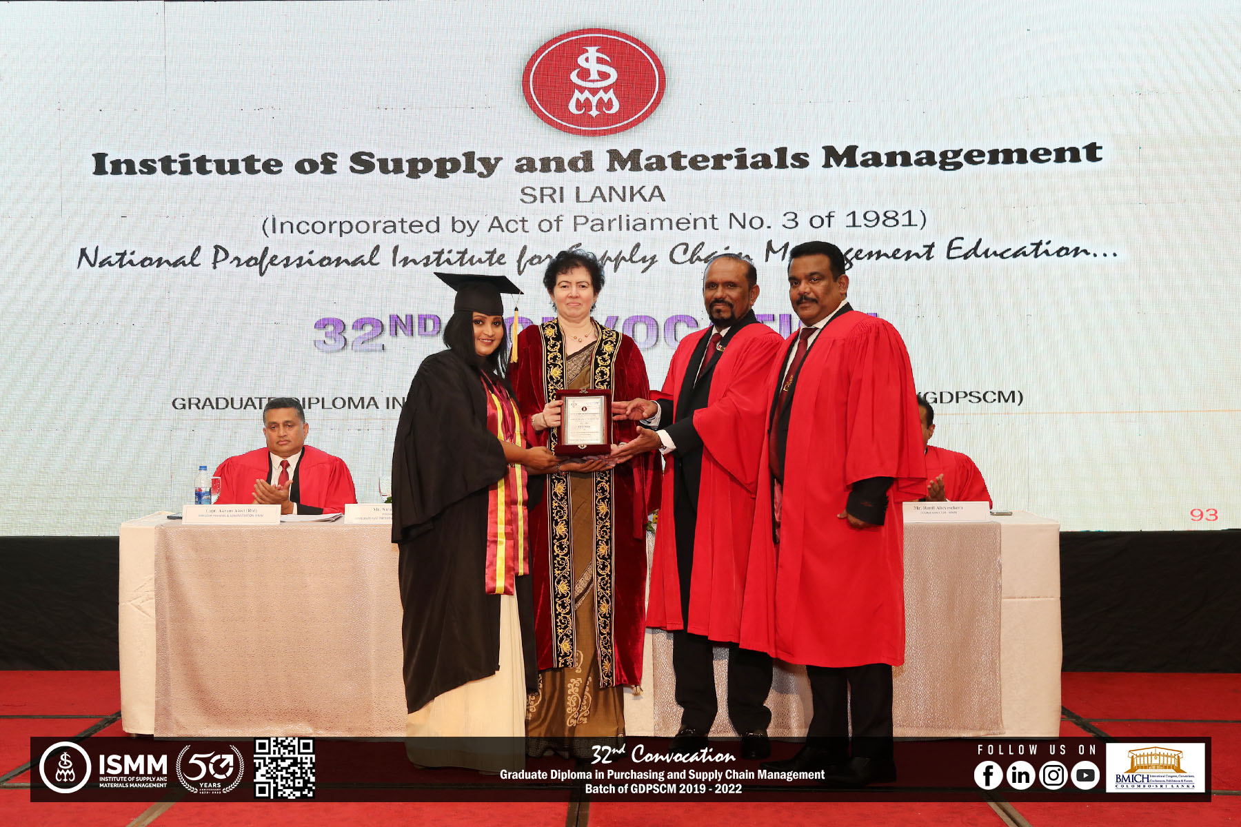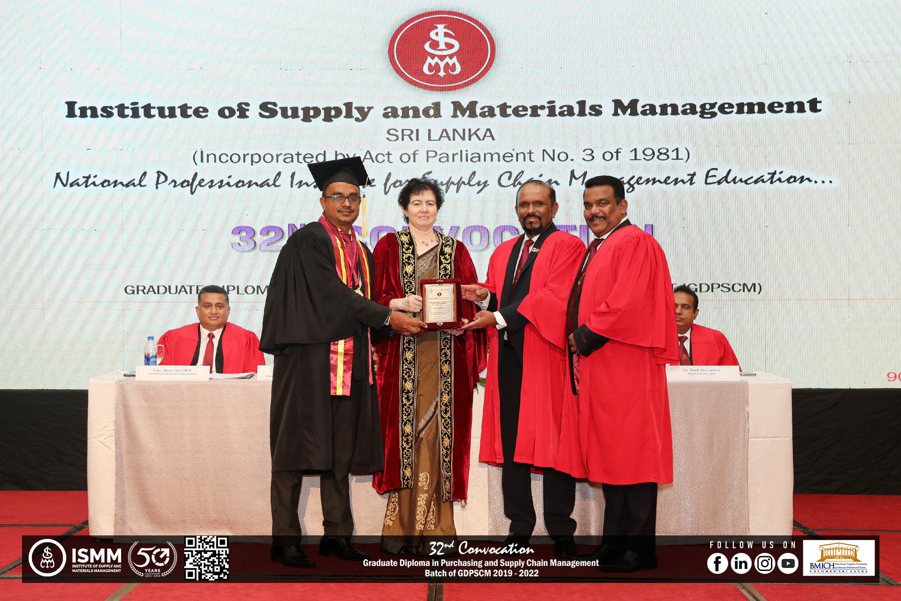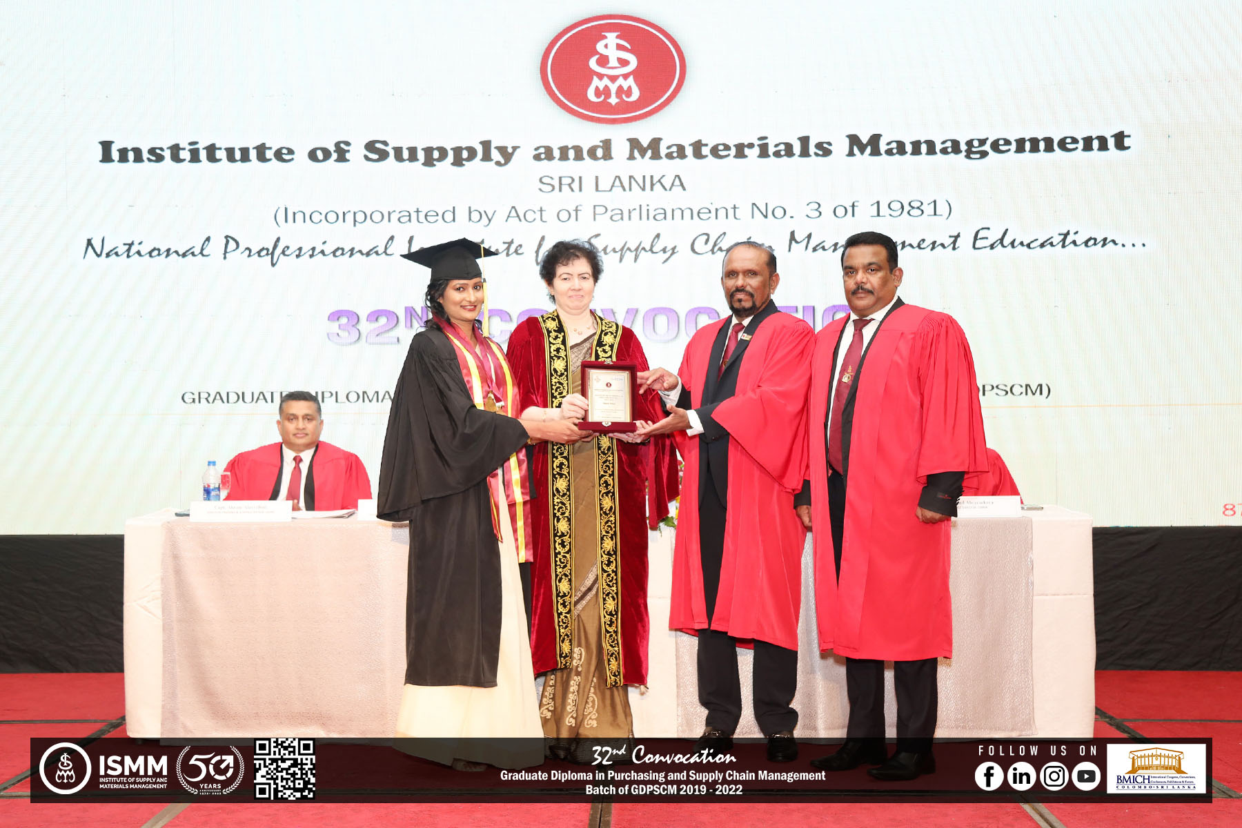The 32nd ISMM Convocation to award Diplomas to students who successfully completed the 3-year Graduate Diploma in Purchasing and Supply Chain Management Course (Batch 2019 - 2022) was held at the BMICH Lotus Hall on 12th January 2024. The Chief Guest was Mrs. Thilaka Jayasundara, Secretary, Ministry of Industries.