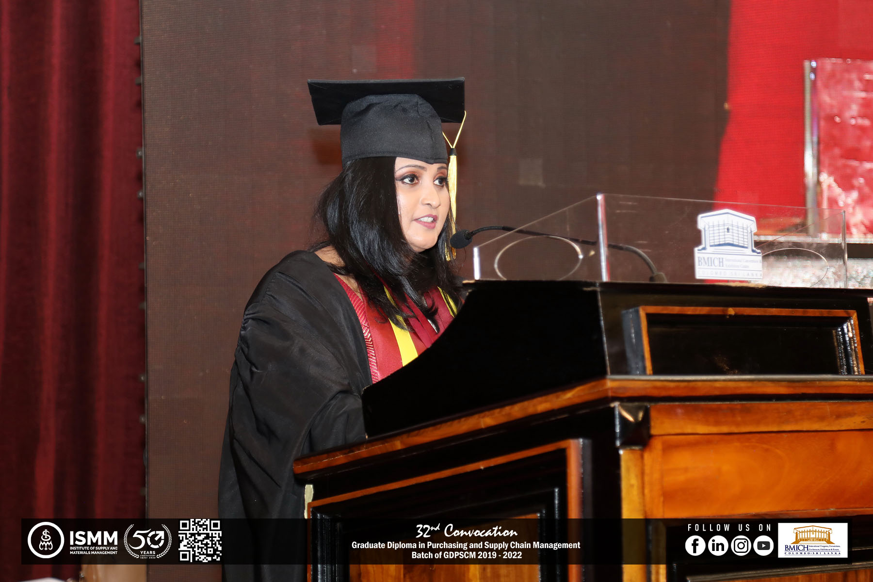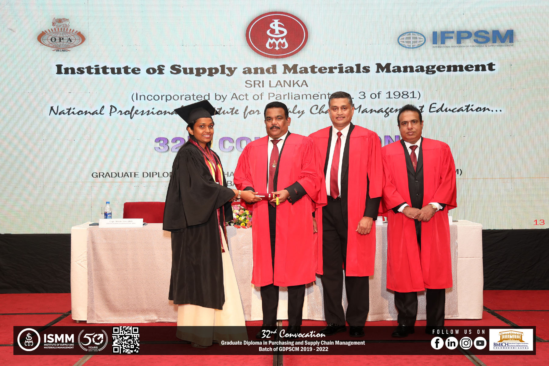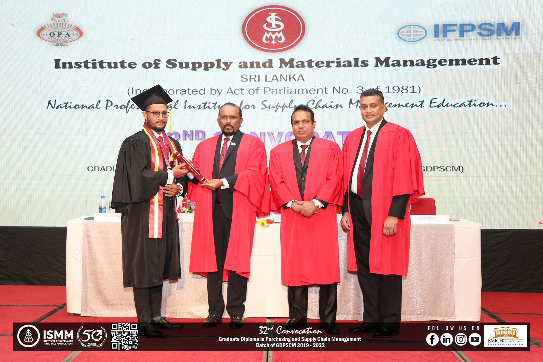 The 32nd ISMM Convocation to award Diplomas to students who successfully completed the 3-year Graduate Diploma in Purchasing and Supply Chain Management Course (Batch 2019 - 2022) was held at the BMICH Lotus Hall on 12th January 2024. The Chief Guest was Mrs. Thilaka Jayasundara, Secretary, Ministry of Industries.