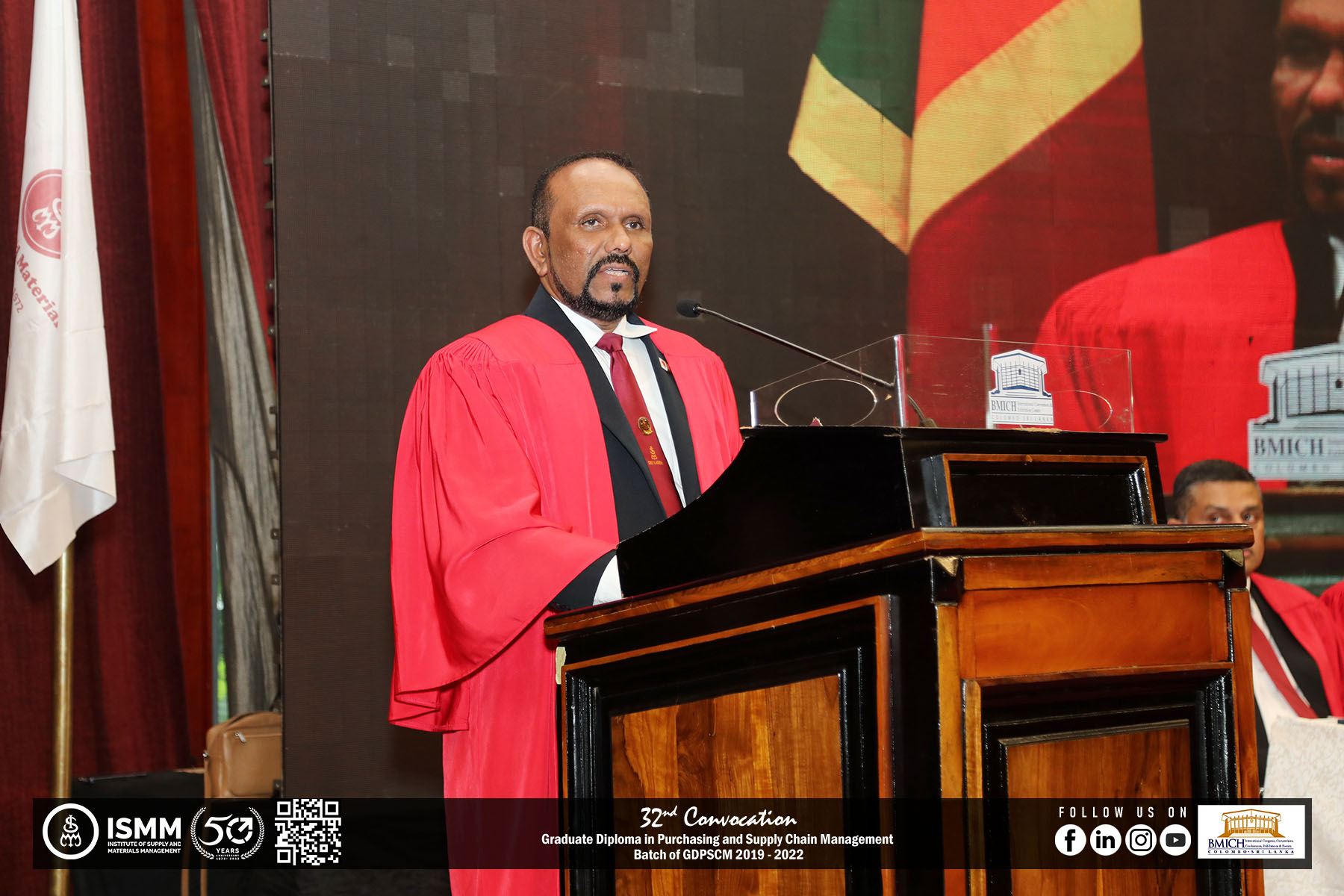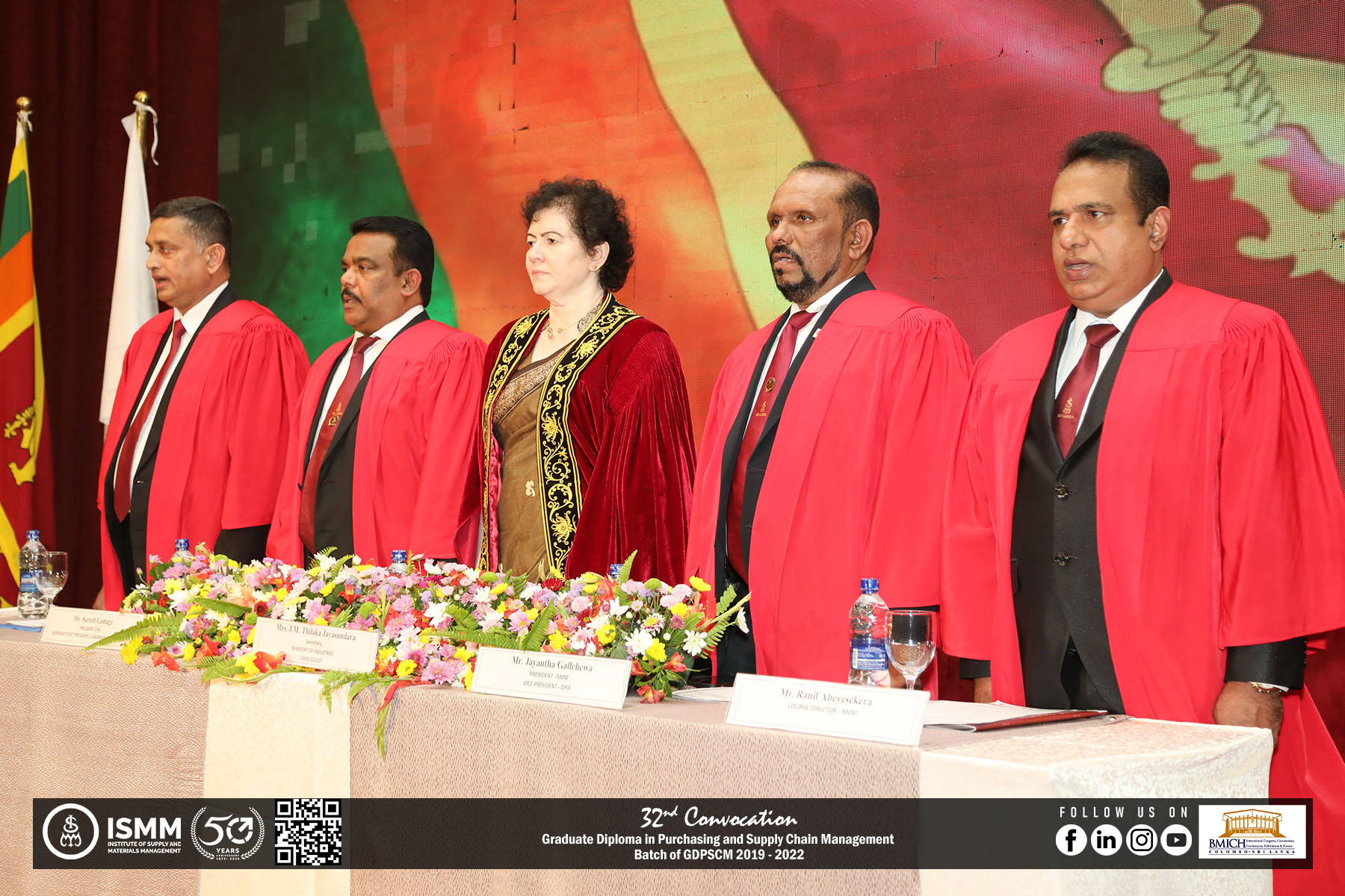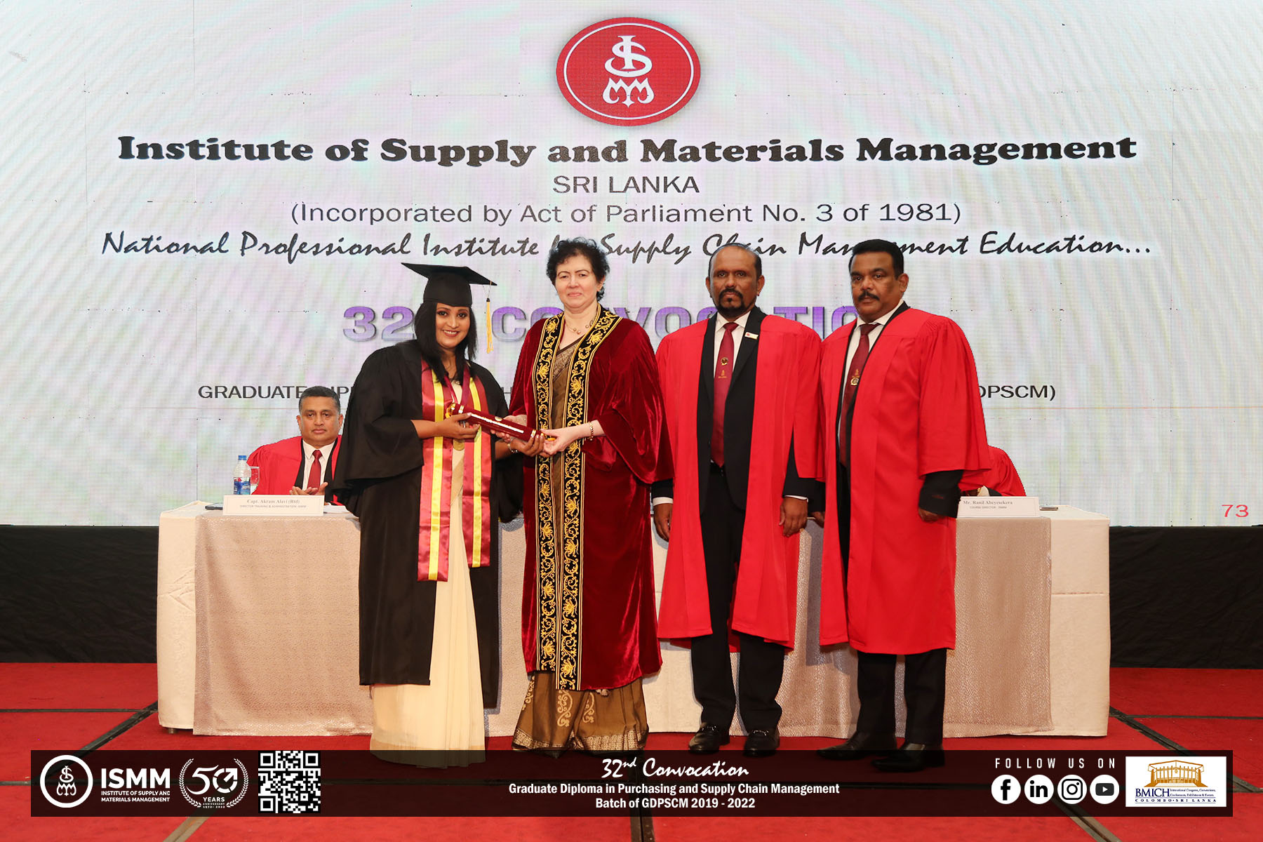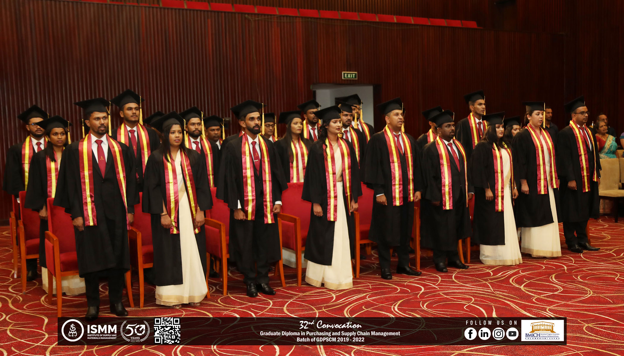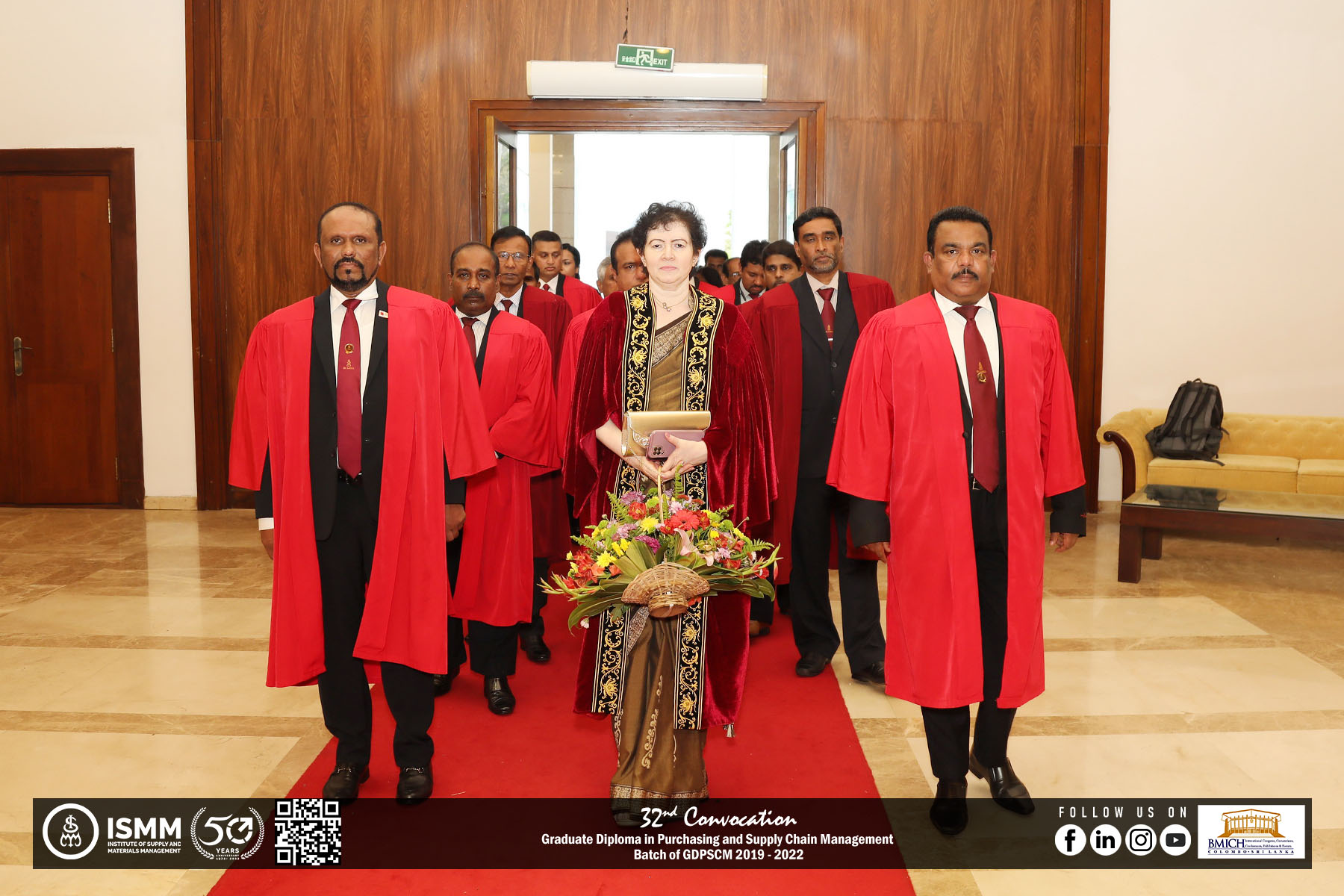 The 32nd ISMM Convocation to award Diplomas to students who successfully completed the 3-year Graduate Diploma in Purchasing and Supply Chain Management Course (Batch 2019 - 2022) was held at the BMICH Lotus Hall on 12th January 2024. The Chief Guest was Mrs. Thilaka Jayasundara, Secretary, Ministry of Industries.